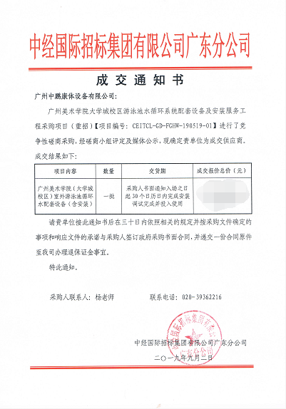 2019年9月2日,在這天從中經國際招標集團有限公司獲悉,經過激烈競標,我司以絕對的優勢中得廣州美術學院大學城校區游泳池水循環系統配套設備及安裝服務工程。